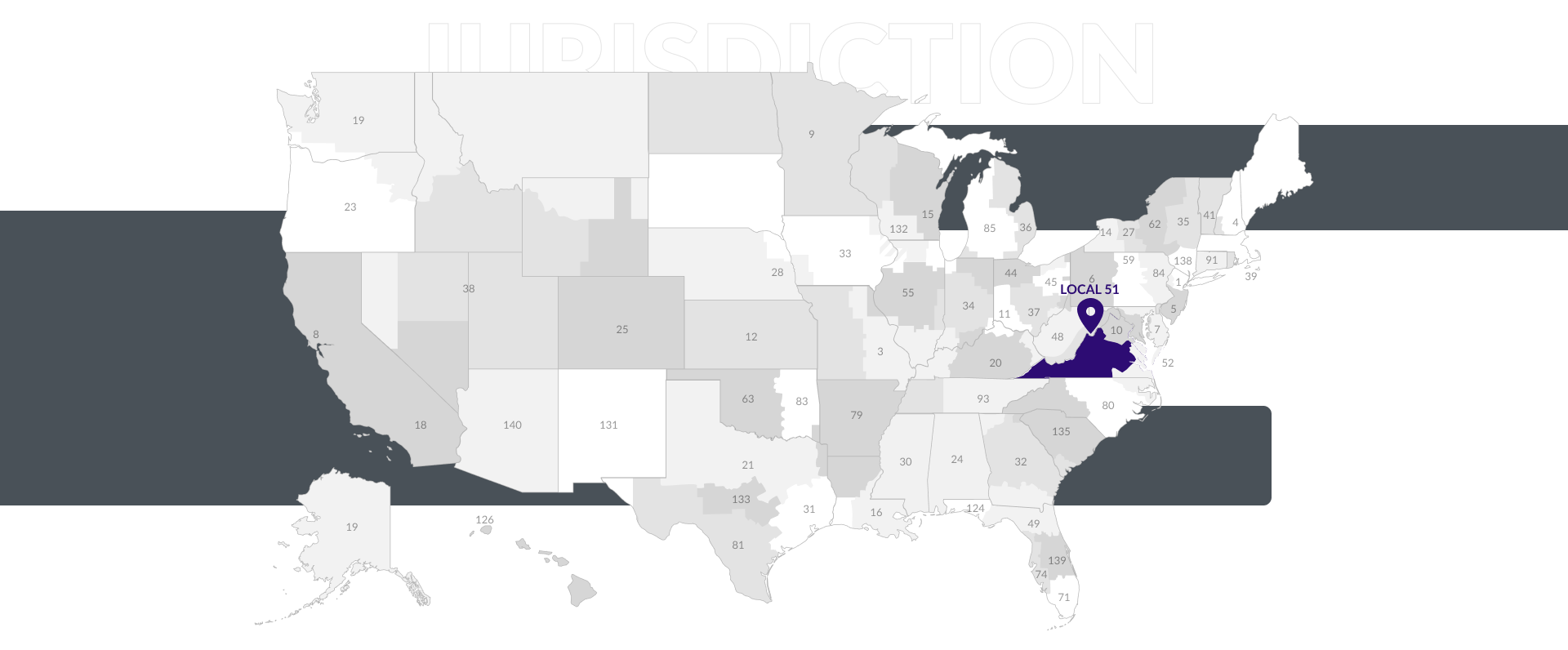 The map above shows the United States of America, with IUEC Local 51’s jurisdiction, covering Richmond and Roanoke, Virginia, highlighted in violet. The Local services both counties with over 200 current members.